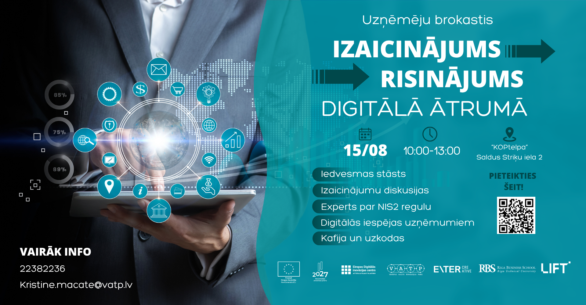 Aicinām Saldus novada uzņēmējus pievienoties iedvesmojošam rītam kopā ar citiem uzņēmējiem un ekspertiem, lai kopīgi ielūkotos uzņēmumiem aktuālajos izaicinājumos, atklātu praktiskus risinājumus un iepazītu digitālās iespējas, kas palīdzēs Tavam biznesam augt un attīstīties digitālā ātrumā!